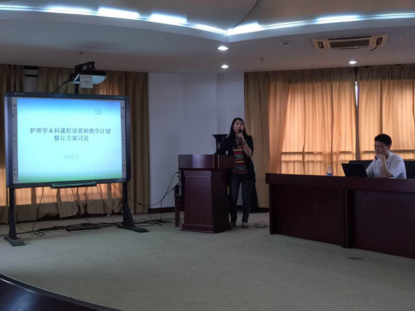 顾艳荭副院长详细介绍了护理本科专业课程设置和教学进程方案修订的设想,明确了我校护理专业与其他院校相比:在核心能力培养上,更强调的是健康护理、健康照护能力、人际沟通和评判思维的能力、人文关怀、人文素养、跨文化的国际视野、知识转化能力、循证护理实践能力、终身学习和自我学习能力;在课程设置上,要以学科为中心模式转化为以生命周期模式,启发各学科的老师突破原有的思维框架,作跨学科融合的探索,淡化学科界线;在教学实施上,要彻底转变原先填鸭式的授课方式,以学生为中心,教学方法中多采用PBL、TBL、CBL等,有效增加讨论、增加学生为主导的发言、增加实践课程。同时,顾副院长对学生的人文素养和临床技能的培养也作了大胆的设想和要求,例如:如何增加人文课程比例、如何实现护理人文的全程化教学,尤其对护理临床技能的培养提出了参照台湾全程临床实践和德国理论与实践交叉模式,启发教师们改变原有的临床见习带教模式,创新设计我校的护生临床技能实践模式。她表示,护理本科课程计划不仅要重视跨文化护理和信息化检索能力的培养、提升英语语言能力的要求,而且在专业特色化模块中还要专门设置老年护理、长期照护、肿瘤护理和舒缓护理、急危重症、卫生保健、社区健康护理等,切实与当今人群健康服务需求特点相吻合。