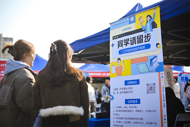 为了这次招聘会,张鑫芃做了充足的准备。她提前了解参会医院以及企业的相关信息。在现场,她详细询问用人单位的业务范围、研发方向、人才培养机制等。面对招聘人员的提问,她自信作答,展现出扎实的专业素养和良好的沟通能力。尽管现场竞争激烈,但张鑫芃对未来充满信心:“这场招聘会给我们提供了很多机会,我相信只要保持积极的心态,不断努力,一定能找到适合自己的岗位。”
