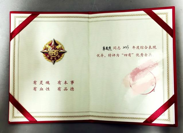 2024年的春节,这是我第一次在外地过年,万家灯火璀璨,分队同样是热闹温馨,年夜饭上,战友们共同庆祝,以汤代酒,敬远方父母,敬身后山河,饭后依旧有人要坚守在风雪呼啸的哨位上,平凡的坚守正是军营独特的年味。这一年里,我被评为“四有”优秀士兵,并获嘉奖一次,自己的努力终有所回报,也收获了深刻的战友情谊与独特的迷彩记忆。