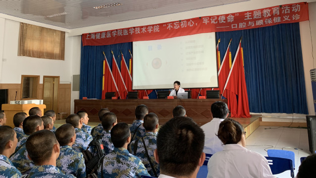 首先,教导员代表全体官兵对我院师生的到来表示热烈欢迎。随后党支部书记、口腔教研室主任周璟和纪检委员、眼视光教师陆俊杰向300位新兵分别作了开展了口腔保健和眼保健的科普讲座。讲座从口腔常见的龋病、牙周病的预防到日常视力的防护等,内容充实丰富、生动有趣、深受士兵喜爱。讲座结尾,大家与士兵们开展了口腔与眼睛保健知识互动抢答,现场气氛十分热烈。接下来,老师们发挥自己的专业特长,现场为新兵战士们开展了义务口腔检查和视力检查服务。党员老师们在提供医疗保健志愿服务的同时,也深深被士兵们保家卫国、勤于操练、不怕苦累的精神感染。如何坚定信念、为民服务,不忘初心、牢记使命,每个党员在现场也上了一堂生动的党课。全体党员表示将坚持党的群众路线,树牢宗旨意识,践行党员义务和使命,发挥专业优势,服务社会、积极投身于实现“健康中国”的实践中。