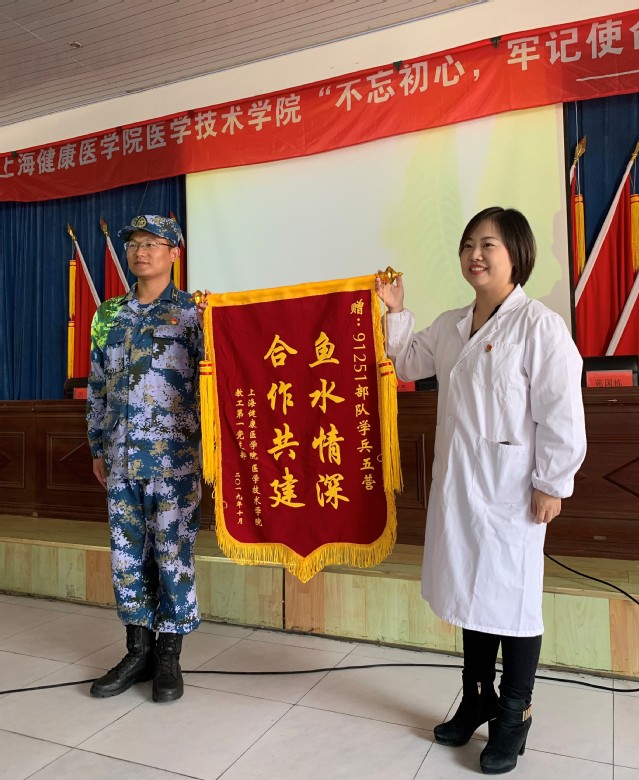 最后,为表示感谢,学兵五营教导员向我院教工党支部颁发感谢状。双方就合作共建初步达成共识,周璟代表党支部向部队营队赠送了“鱼水情深,合作共建”的锦旗。(医学技术学院)