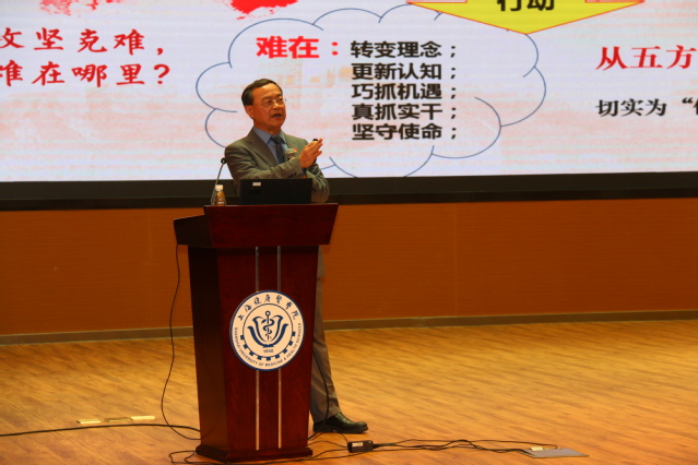 黄钢校长提出要在五个方面加快学校改革发展步伐,一是转变理念,贯彻教育初心,充分发挥主观能动性,在教育教学与教学管理中注入人文元素,让健康人才的培养更加有温度,让健康校园的色彩更加鲜活;二是更新认知,坚持与时俱进,形成师生中心,共同成长,回归本源;实现数据驱动,创新模式,提升效率;达到生态协同,相融相通,互为依存;成就价值提升,坚持定位,创新发展;三是巧抓机遇,服务健康中国,围绕大健康培养人才,服务大健康相关领域,扎根健康中国大地办学,培养基层健康的守护人,引入先进技术理念,构建互动学习环境;四是真抓实干,推进创新学习,积极探索适合我校作为应用型人才培养基本目标的以项目为主导的育人模式;五是坚守使命,实现共同成长,教师和学生都要做到政治要强、情怀要深、思维要新、视野要广、自律要严、人格要正。