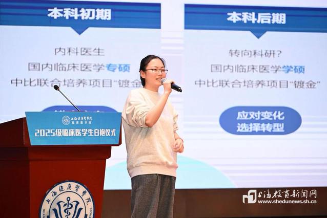 仪式尾声,学院向全体新生发出号召,期望大家怀揣理想,融合科学精神与人文关怀,坚定走好医学之路。随后举办的“医路青年说”活动中,2024届优秀毕业生、比利时列日大学博士生孙心怡与巴尼亚卢卡大学海外交流项目学生代表,结合自身经历分享了职业规划与国际研修体验。他们的分享旨在引导新生明晰发展方向、开阔全球视野,为其医学征程的开启注入信心与动力。