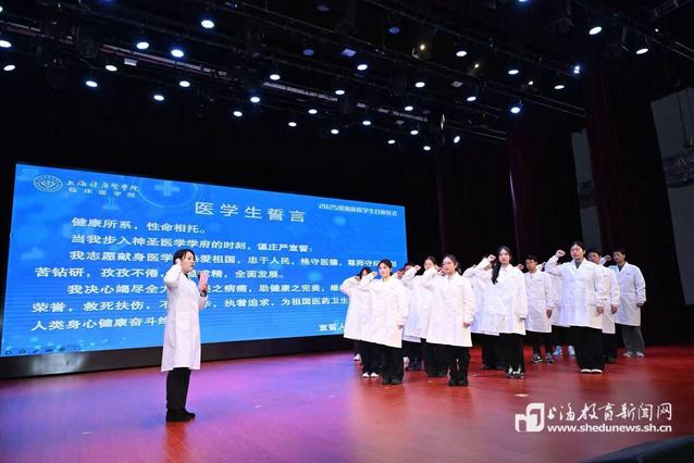 授袍仪式后,全国基层就业先进个人、上海市嘉定区嘉定镇街道社区卫生服务中心全科主治医师、优秀校友卢婷医生,带领全体2025级新生庄严宣读医学生誓言。“健康所系,性命相托……”铿锵有力的誓言,是医学生对职业的郑重承诺,也是对“救死扶伤、无私奉献”精神的自觉传承,旨在勉励全体新生铭记初心,以仁爱守护生命,以医术践行诺言,终生坚守对生命的敬畏与信仰。