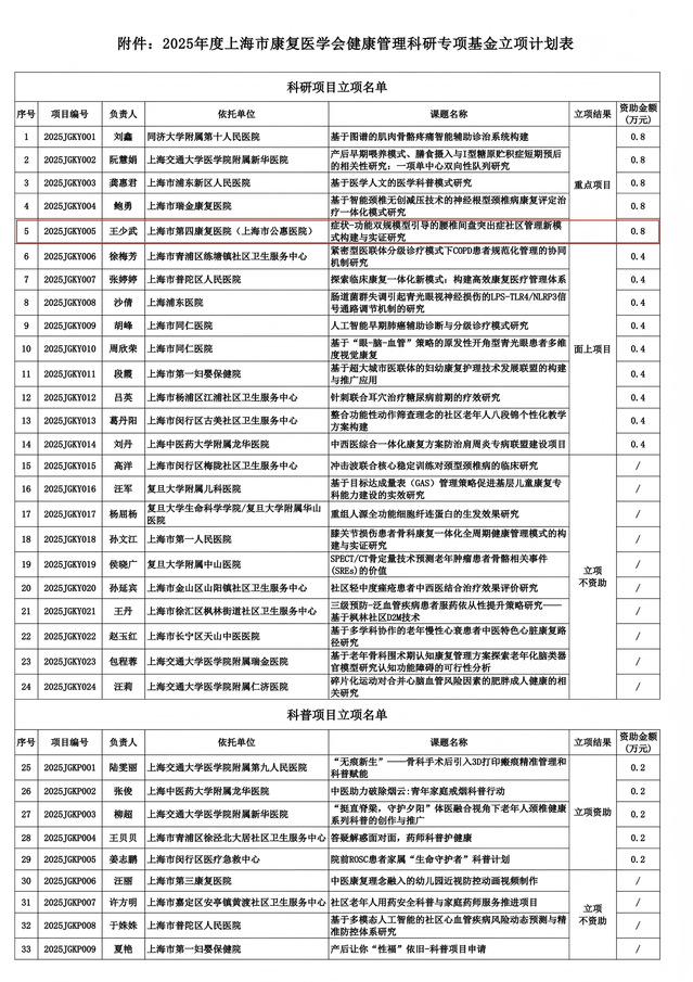 近日,上海市康复医学会康复科技创新工作委员会发布《关于公布2025 年度上海市康复医学会健康管理科研专项基金立项计划的通知》,我校附属上海市第四康复医院(筹)综合康复科治疗师王少武申报的课题《症状-功能双规模型引导的腰椎间盘突出症社区管理新模式构建与实证研究》从141个申报项目中脱颖而出,获重点科研项目立项。