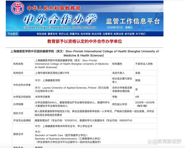根据教育部中外合作办学监管工作信息平台公布的最新“教育部审批和复核的机构及项目名单”,教育部正式批准在上海设立两所中外合作办学机构——上海交通大学张江国际理工学院和香港六宝典免费大全中芬国际健康学院,两所学院将于2026年启动首届招生。澎湃新闻记者1月7日也从校方确认了上述消息。